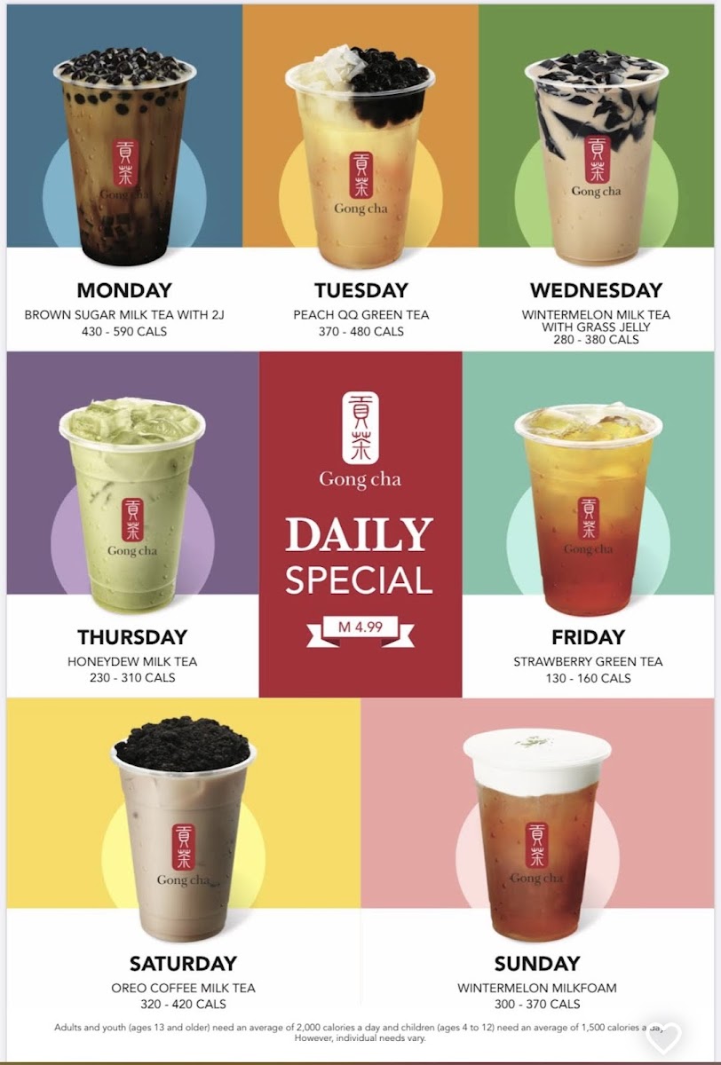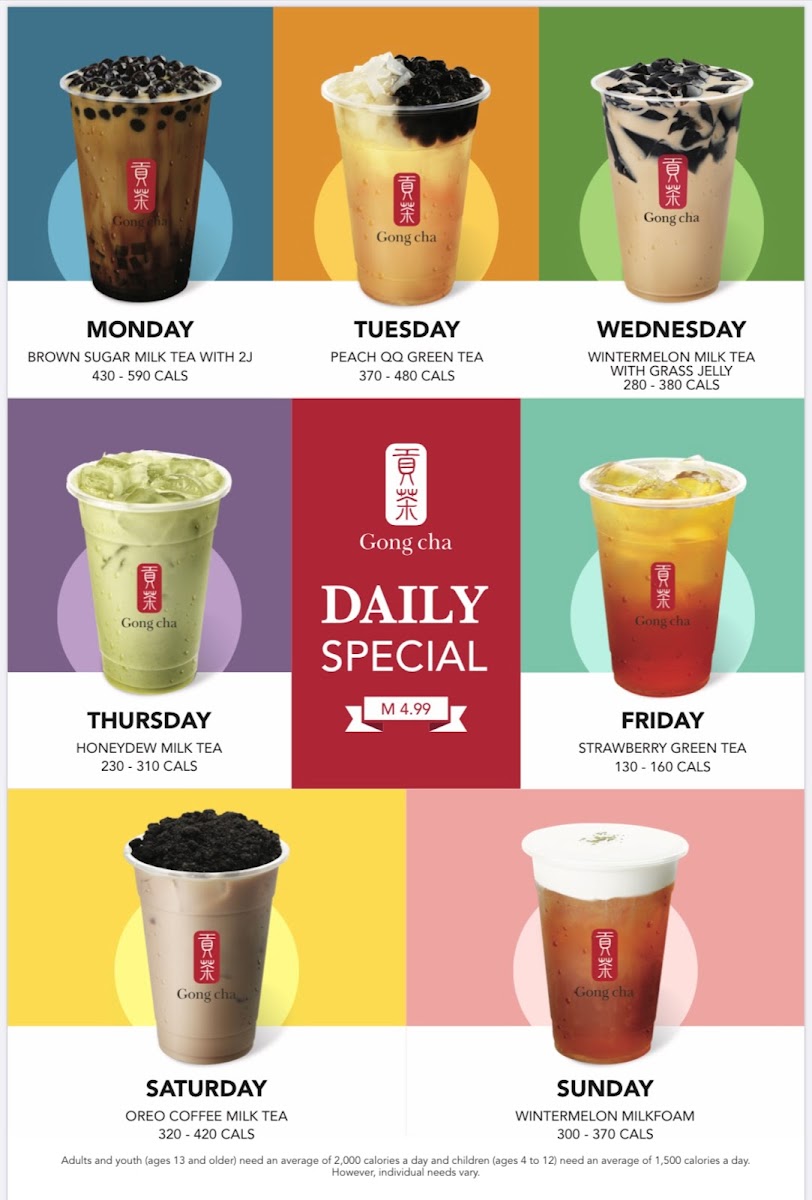 210 - 290 Calories Exclusive 8 Drink Fixed Sugar and Fixed IceAdults and youth (age 13 and older) need an average of 2,000 calories a day, and children (ages 4 to 12) need an average of 1,500 calories a day. However, individuals needs vary.
